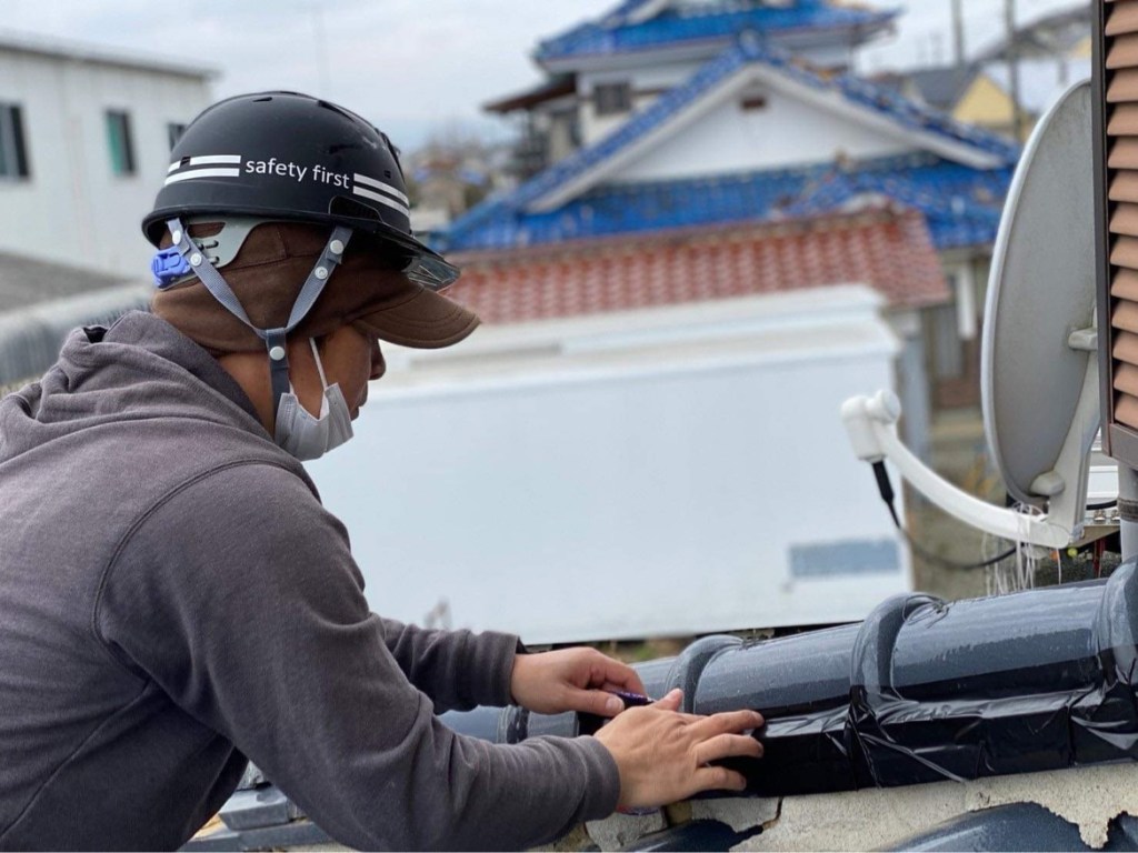 風で吹き飛ばされた屋根の応急処置。